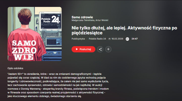 Po pięćdziesiątce ruch przestaje być dodatkiem. Staje się raczej polisą ubezpieczeniową, inwestycją w przyszłość. I albo zaczniemy w tym momencie życie, albo za kilkanaście lat zapłacimy wysoką cenę brakiem sprawności. To naprawdę ostatni moment, kiedy można dużo zmienić stosunkowo małym wysiłkiem – o tym m.in. mówiłam w audycji SAMO ZDROWIE w Polskieradio24.pl.
