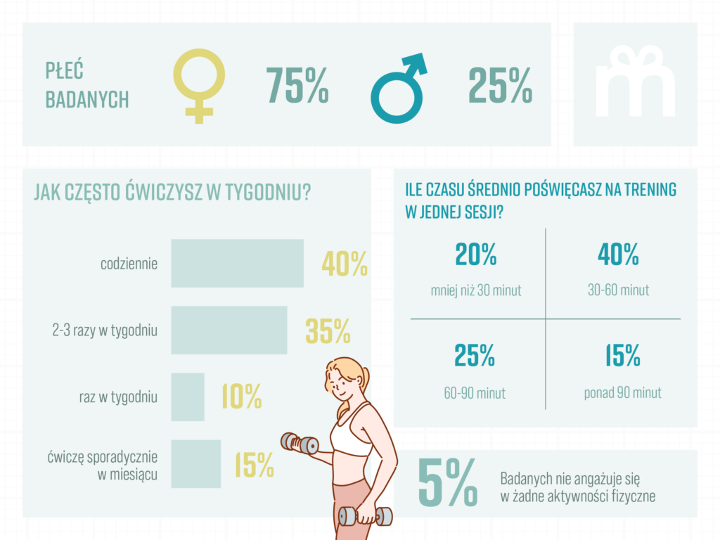 Należy zaznaczyć, że największą grupę badanych, bo ponad połowę, stanowili Millenialsi. Dla 60% respondentów główną motywacją do ćwiczeń jest utrzymanie zdrowia i dobrej kondycji fizycznej. Jedynie 20% osób wymienia redukcję masy ciała jako kluczowy cel swojej aktywności. Mniejsza grupa ankietowanych – 10% osób, postrzega ćwiczenia jako metodę relaksu i sposób na radzenie sobie z napięciem. Pokazuje to, że coraz częściej ćwiczenia stają się narzędziem relaksującym w czasach rosnącego stresu w społeczeństwie.